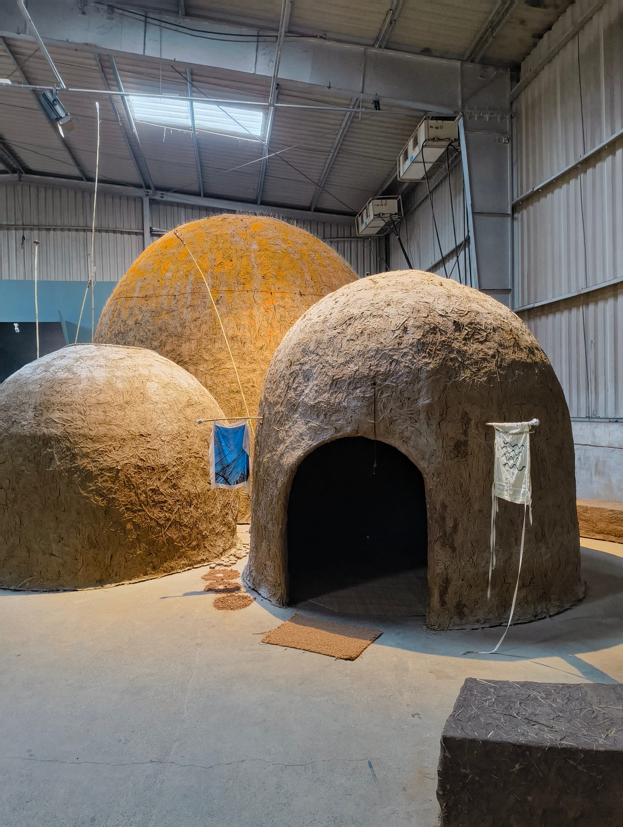 Dineo Seshee Bopape’s Mme Mmu, Bhumi Bhumi is an installation built around nine earth mounds that quietly transform the exhibition space into a site of reflection and grounding. The forms echo temple and stupa-like structures while drawing inspiration from Seolo termite mounds, which carry sacred significance in parts of southern Africa.