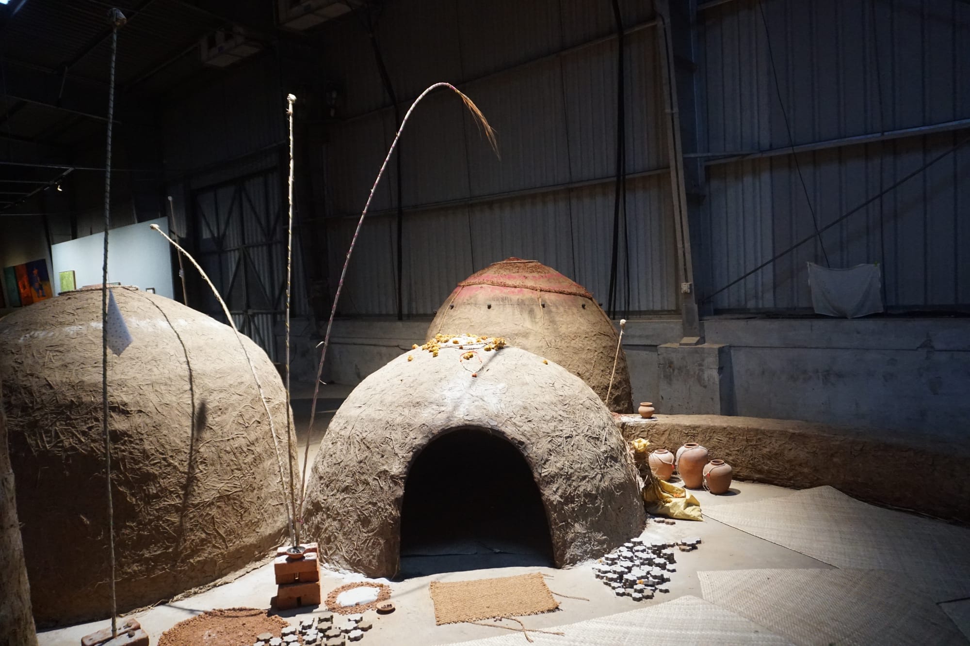 Dineo Seshee Bopape’s Mme Mmu, Bhumi Bhumi is an installation built around nine earth mounds that quietly transform the exhibition space into a site of reflection and grounding. The forms echo temple and stupa-like structures while drawing inspiration from Seolo termite mounds, which carry sacred significance in parts of southern Africa.