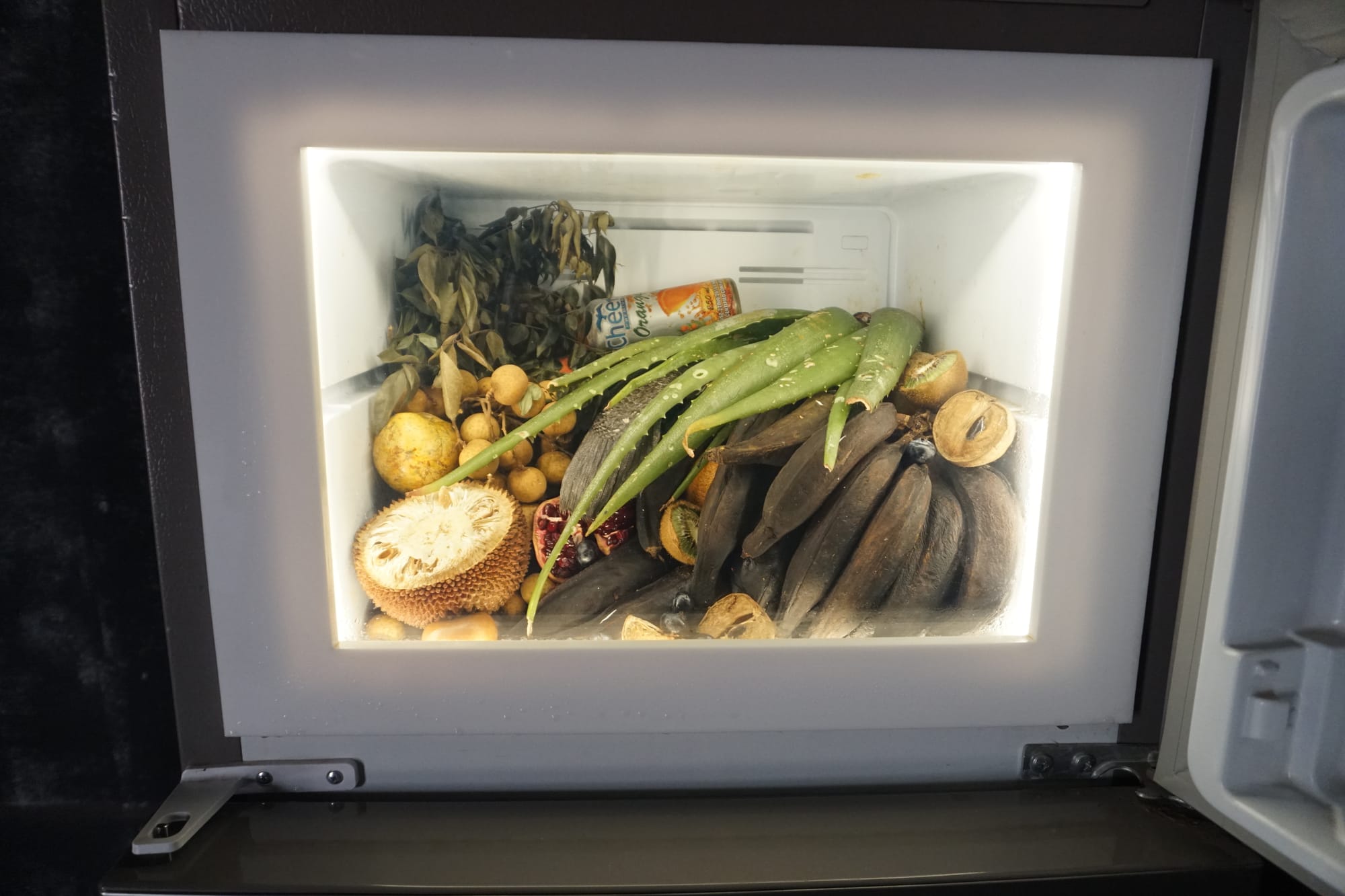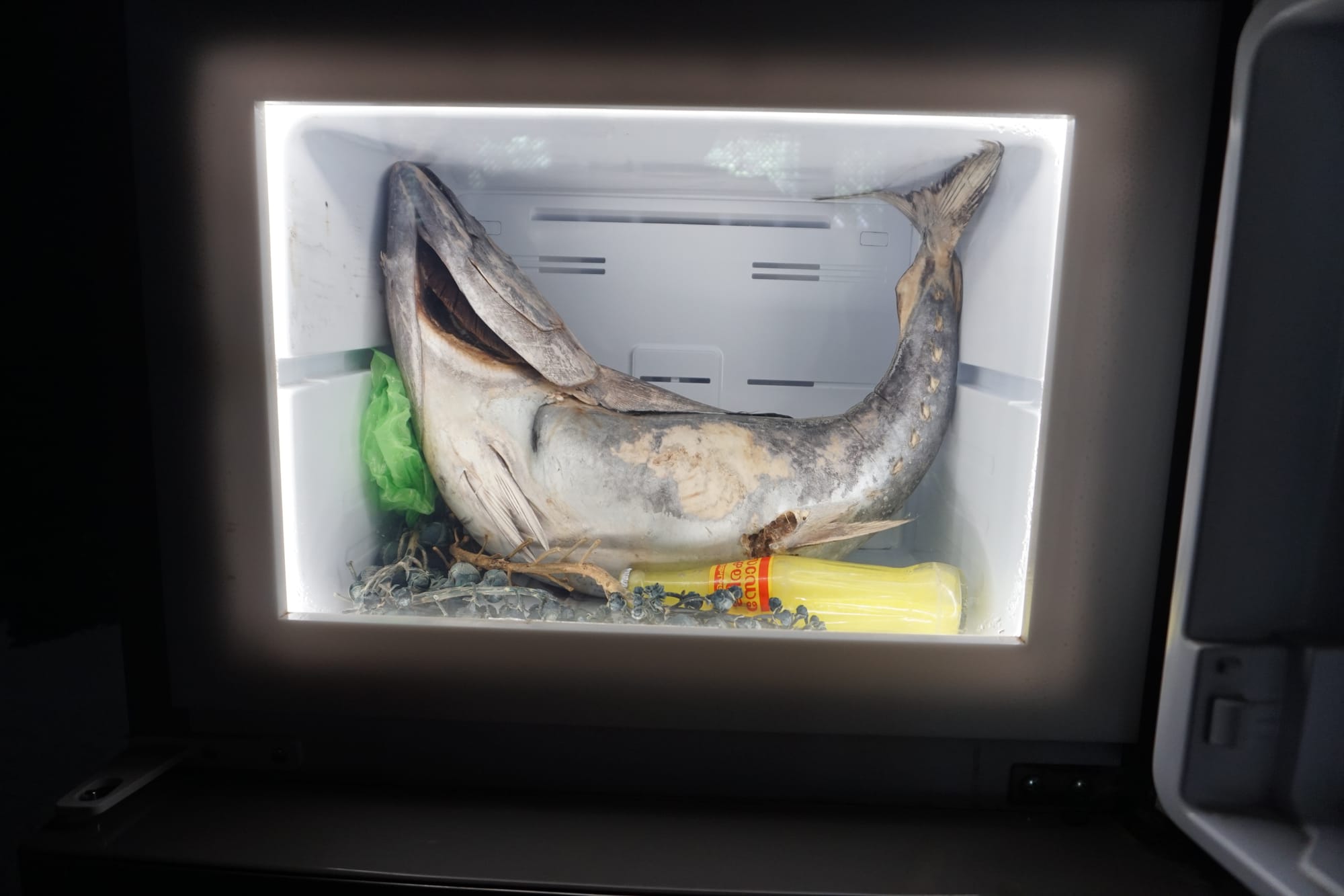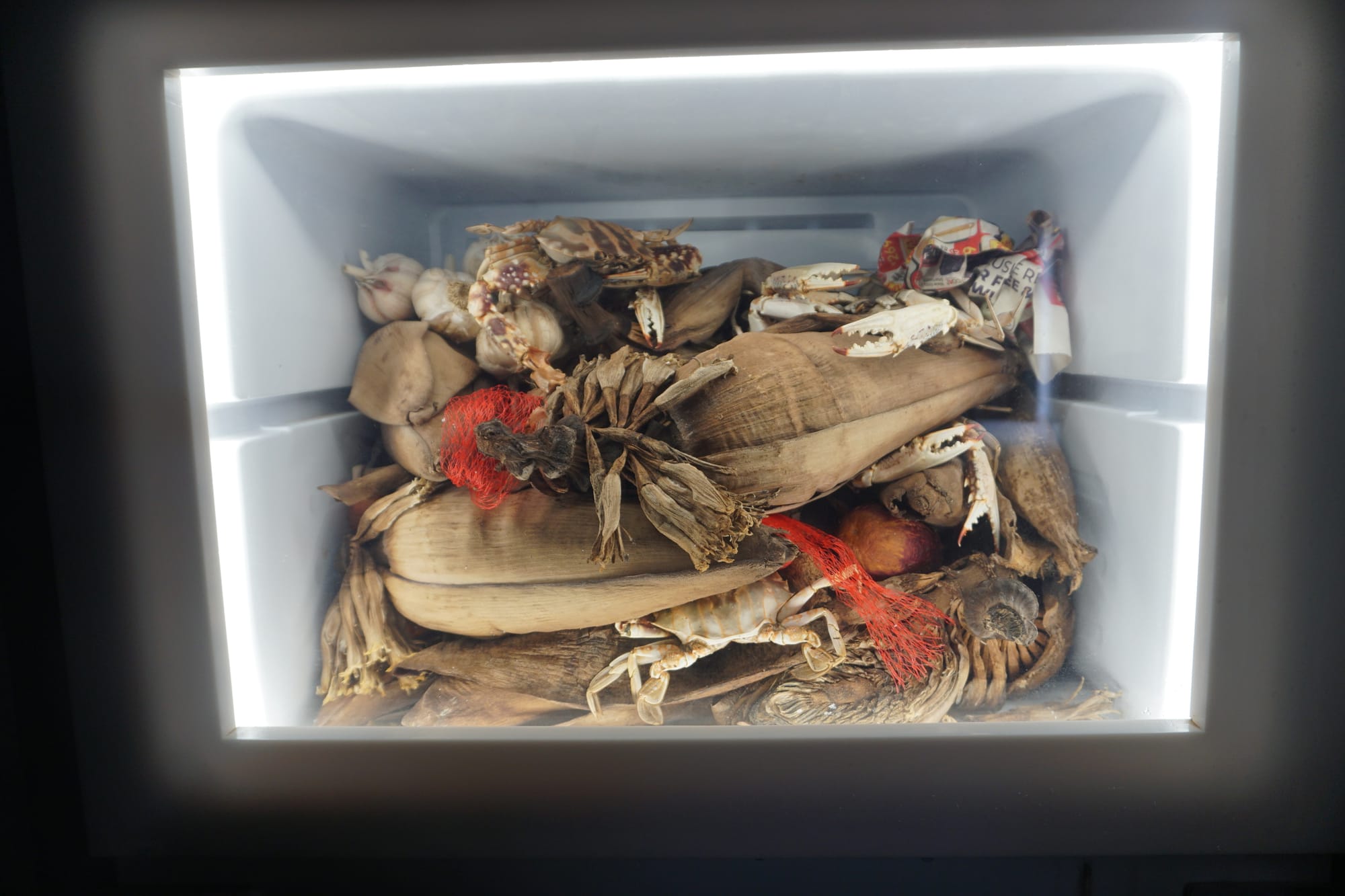 At the Coir Godown in Aspinwall, he presented sculptures from his Rinascimento series, in which obsolete refrigerators were transformed into display cases containing organic materials such as meat, fish, fruits, and packaged beverages in varying states of decay.