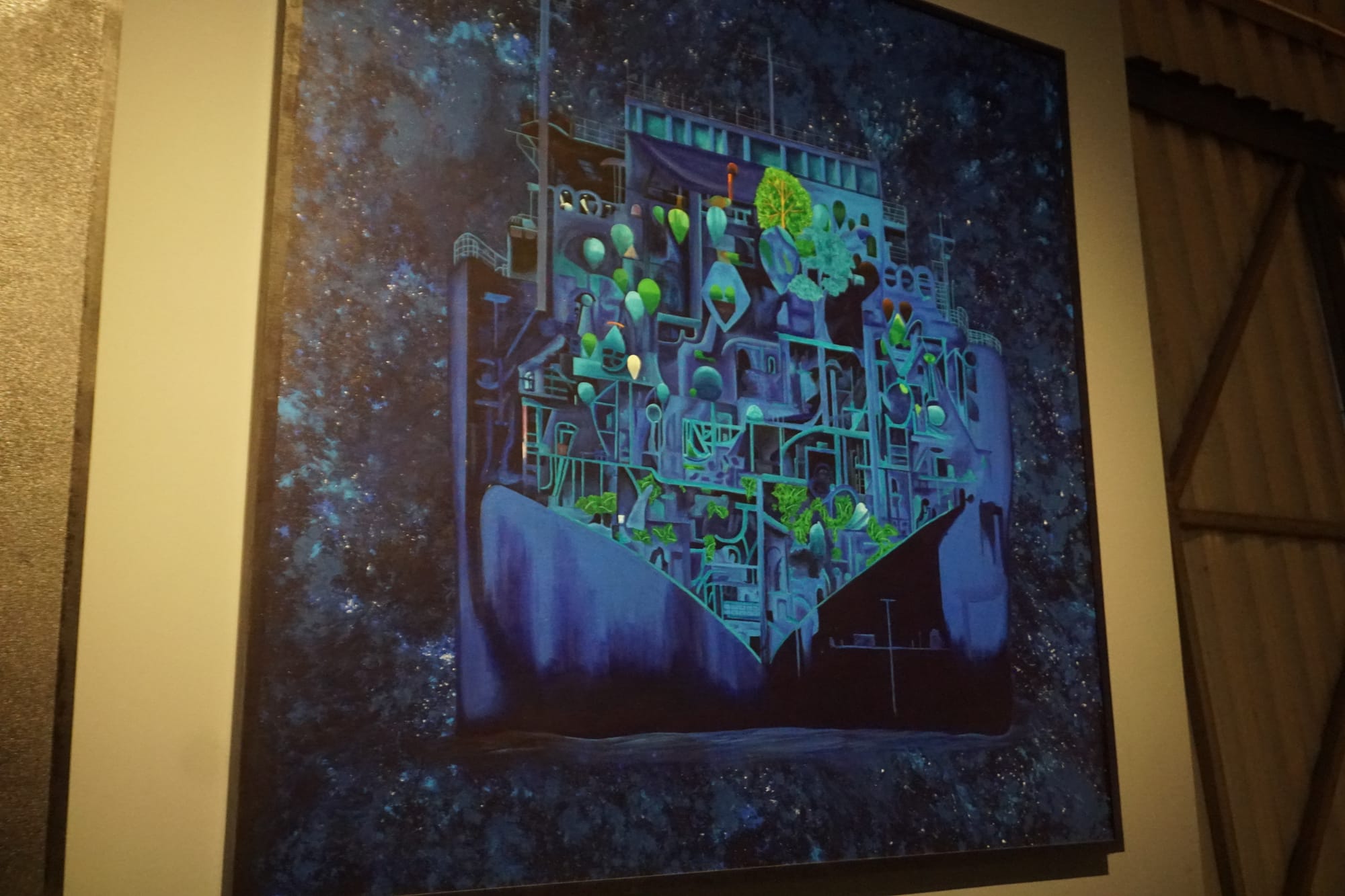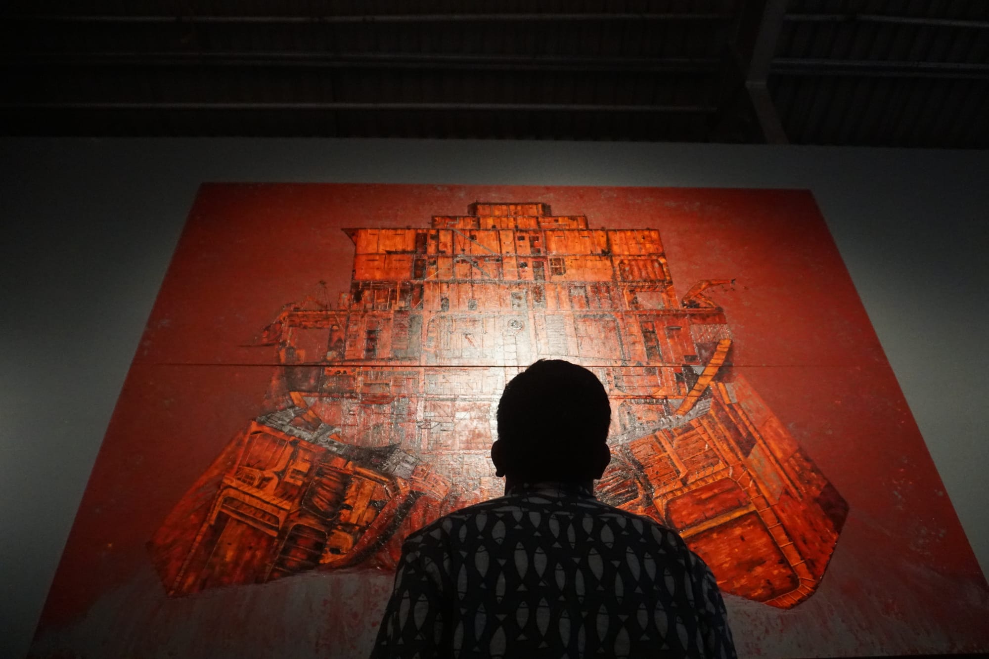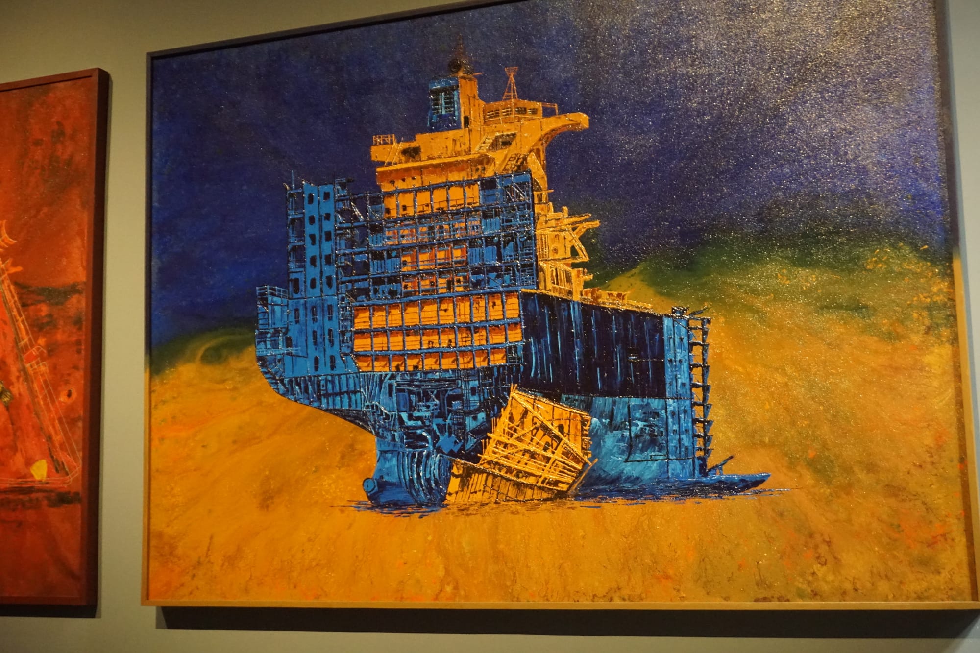 Another compelling work was by Himanshu Jamod, whose large mixed‑media paintings explore the life cycles of merchant ships.